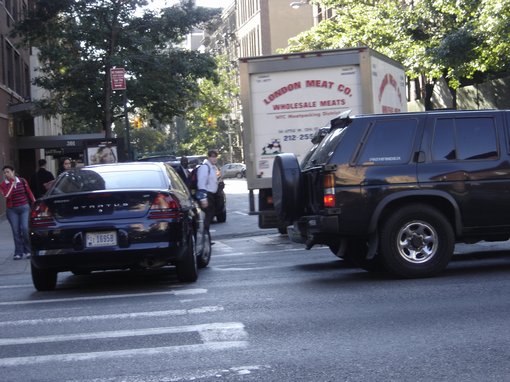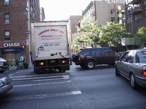 In the scene above, cars heading down Second Avenue in the 60s blocked the box (60th and Second was the worst intersection for blocked box in the Borough President’s analysis) for vehicles heading eastward. Instead of patiently waiting for the obstruction to clear, the London Meat Truck (212-255-2153) drove up onto the pedestrian crosswalk, but still couldn’t make it’s way to the next block until people on the sidewalk backed up to allow it space to squeeze through. But then other cars were following the truck, even after the light turned, forcing pedestrians back on the curb, even though they had the signal.