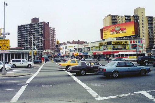 A long walk across Queens Blvd. at Grand Ave., Elmhurst, circa March 2001. Photo: Jeff Saltzman