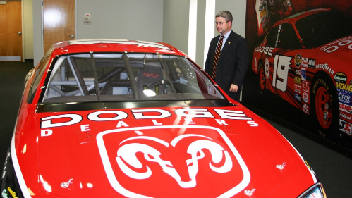 Congressman Patrick McHenry standing with an automobile, which, as it happens, was also invented in the 19th century.