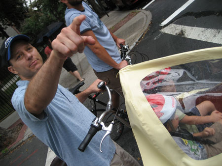 My friend Jonathan and I loaded up our 70 pounds-worth of pre-schoolers into the "Batmobike" on Sunday and headed over to Williamsburg Walks. My brother Abe joined us as well. Ominous looking clouds were rolling in from the west as we left Park Slope around noon. By the time we hit Fort Greene the rain was coming down in sheets. Much to the delight of the boys, we deployed the Batmobike’s rain canopy and waited out the storm under a tree near the corner of Willoughby and Washington.