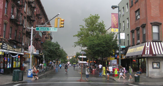 Granted, I’m predisposed to enjoying a car-free street but I really liked Williamsburg Walks. I just find it incredibly nice to be able to step outside onto a commercial street in a crowded city and not have to hear the constant sounds of engine revving, brake squealing and horn honking. It’s nice to have some elbow room and to be able to stand in one place and talk to friends without shouting over the sound of traffic or clogging up the sidewalk. And it’s absolutely great not to have to worry that your kid could take one step in the wrong direction and find himself in the path of a moving SUV.