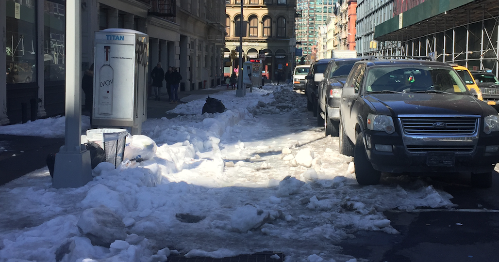It’s been three days since Stella dropped its wintry precipitation on the city, but the protected bike lane on Grand Street in Manhattan remains unusable beneath three-foot mounds of snow.
