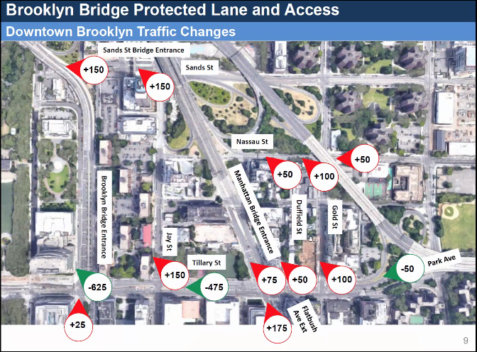 Per the agency’s traffic modeling, the DOT predicted that peak hour traffic volumes of cars going over the Brooklyn Bridge will fall by around 700 to 800 vehicles every morning after the bike lane goes in, which is about a 20-percent drop in traffic. Additionally, the DOT said it believed that 10 percent of the daily Manhattan-bound traffic would divert to the Manhattan Bridge.