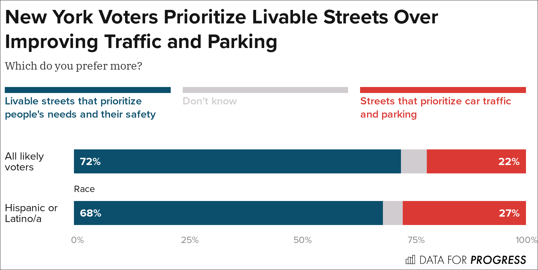 Such results dovetail with a survey conducted earlier this year by Streetsblog’s parent company, Open Plans, and conducted by Data for Progress. In that survey of 571 registered Democrats, 65 percent of voters (and 72 percent of Hispanic or Latino voters) said affirmatively, “Drivers in my neighborhood need to slow down.” And 72 percent agreed that the city must create “livable streets that prioritize people’s needs and their safety” over “streets that prioritize car traffic and parking.”