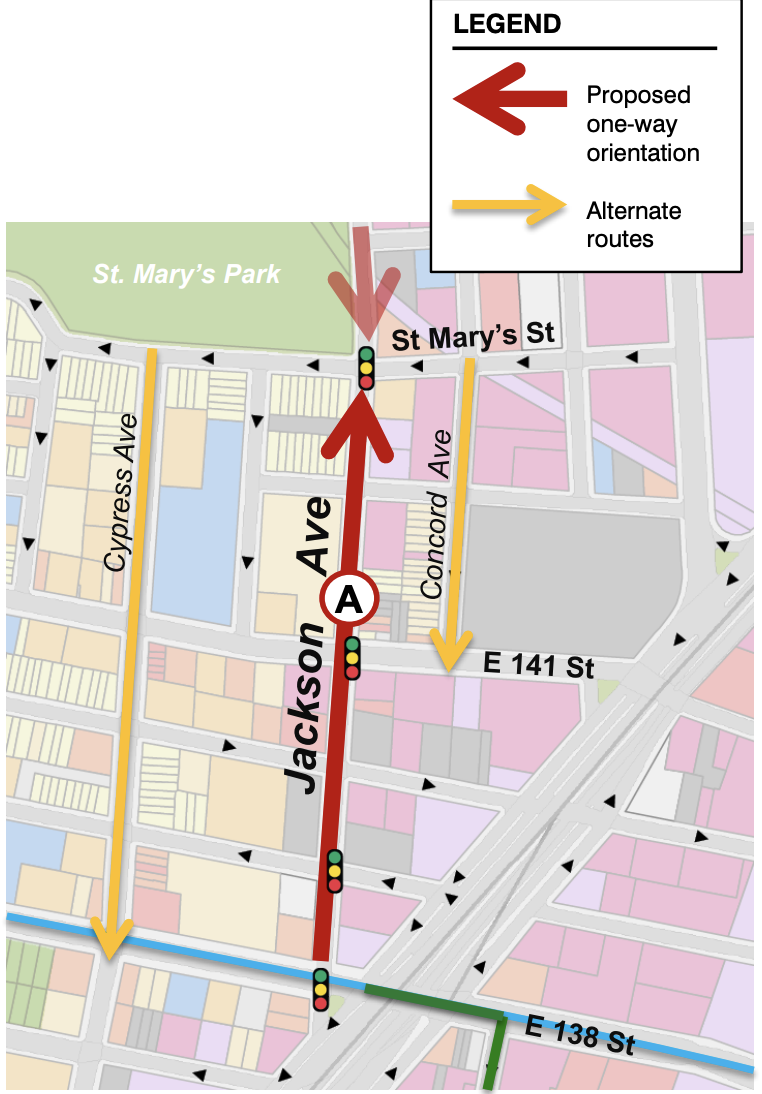 Between 138th Street and 143rd Street (also known as St. Mary’s Place), the DOT plans to convert the two-way street to one-way northbound. Southbound traffic would be mostly redirected to Concord Avenue, one block to the west. A two-way bike lane will be installed on the west curb.