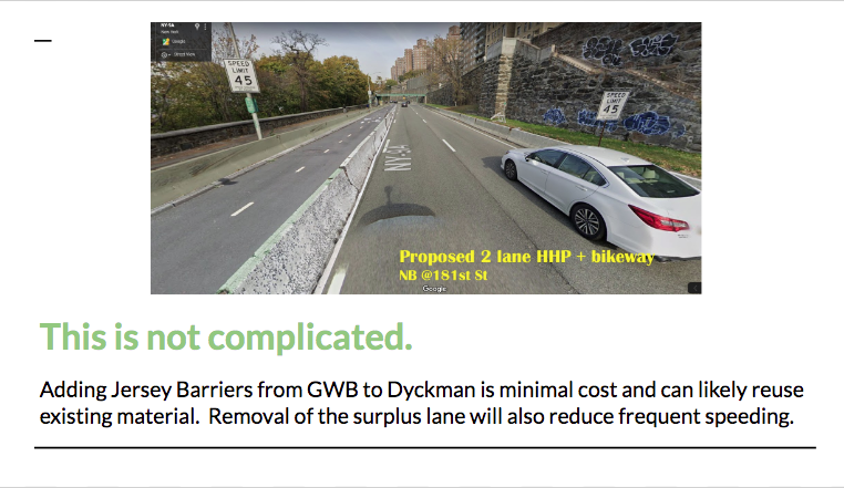 Judging by Parks’s previous construction detours, this one is likely to endanger and inconvenience all users, some more than others, especially because the neighborhood is so hilly. Parks should ask State DOT to borrow an underused lane of the Henry Hudson Parkway, as grassroots activists and Community Board 12 have recommended. But the department inexplicably has failed to explore what is by far the safest and most convenient detour option.