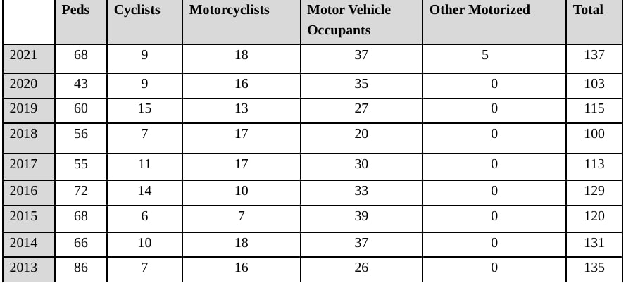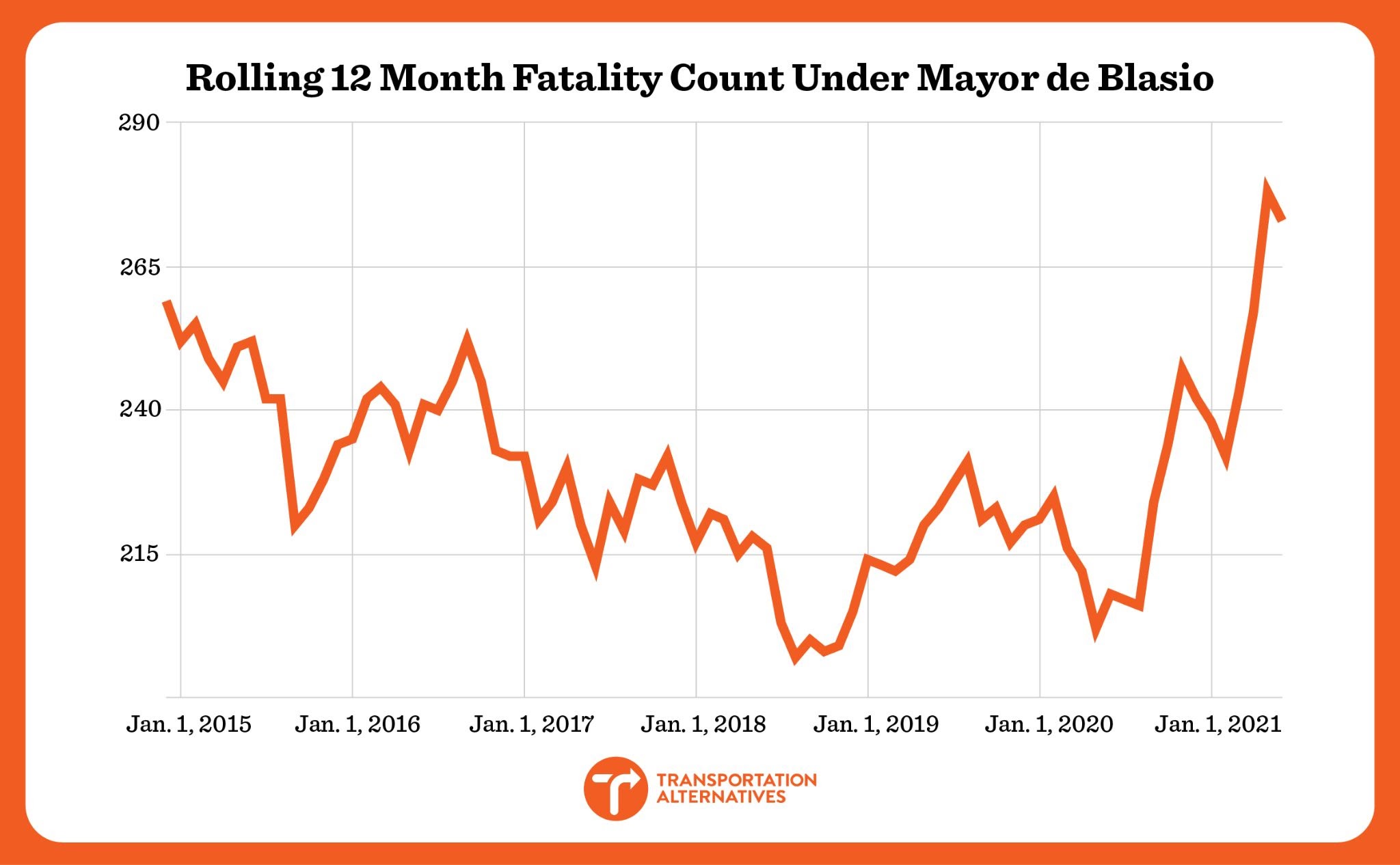 Pedestrian deaths are surging — 68 this year, compared to 43 at this point in 2020, a jump of nearly 60 percent. May was especially deadly. According to an analysis by Transportation Alternatives, Brooklyn, Queens and the Bronx all broke or tied fatality records that month. More than 1,700 New Yorkers have been killed by drivers since de Blasio took office in 2014, the same year he instituted Vision Zero. Traffic deaths steadily dropped, though pedestrian deaths began to tick up again in 2017. In mid-2020, traffic fatalities began a steep rise, fueled by reckless drivers who speed down roads that have yet to be calmed with appropriate infrastructure.