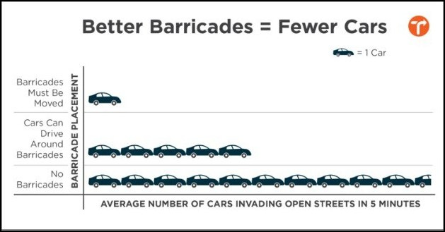 When open streets were secured with barricades that drivers could maneuver around without getting out of their car, observers saw five cars on average per five minutes of observation, and surveyors saw 10 cars in five minutes of observation on open streets with no barriers at all.
