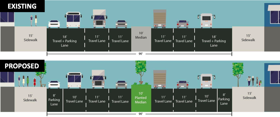 The agency’s plan? Replace the three fast-moving, wide lanes with … three fast-moving, wide lanes. Here is the picture that DOT actually presented to board members. Note the only change is a green median strip: