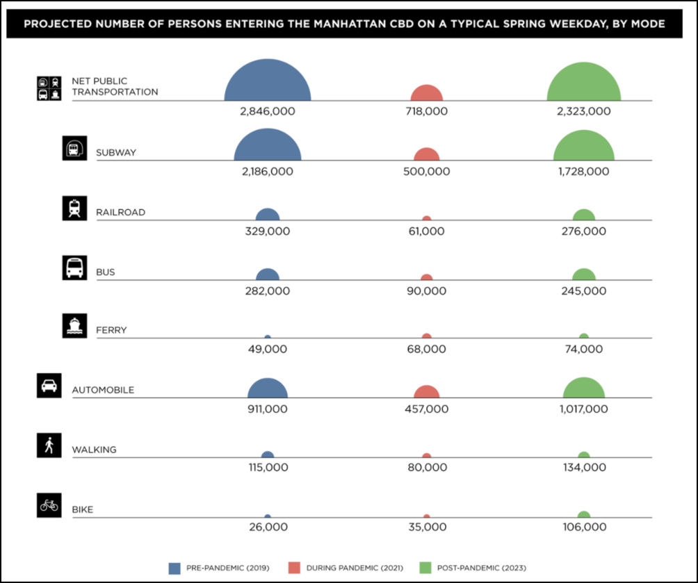 Sam Schwartz Engineering and Clarion Research surveyed Connecticut, New Jersey and New York residents on their travel habits into Manhattan south of 60th Street and ask them how they would change after the pandemic. The bad news? The answers suggest that almost 90,000 extra private cars are going to jam the streets of the city’s central living district in 2023. More bad news? The share of public transportation trips into the area is also going to drop.