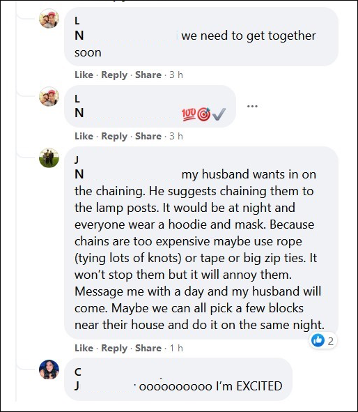 In a private Facebook group, opponents of the open street openly discussed on Monday acts of vandalism to deter open streets volunteers. “My husband wants in on the chaining,” one woman posted. “He suggests chaining them to he lamp posts. It would be at night and everyone wear a hoodie and a mask. … It won’t stop them, but it will annoy them.”