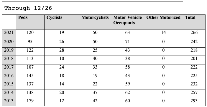 The result of a city with more cars on the road is a city with more crashes and more bloodshed. Through Dec. 26, 266 people have been killed in the five boroughs this year, including 120 pedestrians and 19 cyclists — the highest number since de Blasio took office in 2014, when 257 people were killed through the same date that year.