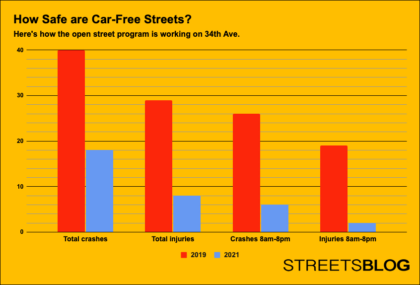 Streetsblog also found that crashes and injures dropped dramatically even outside the open street hours, most likely because fewer drivers use 34th Avenue, having become accustomed to the fact that it is off-limits to them half the day.