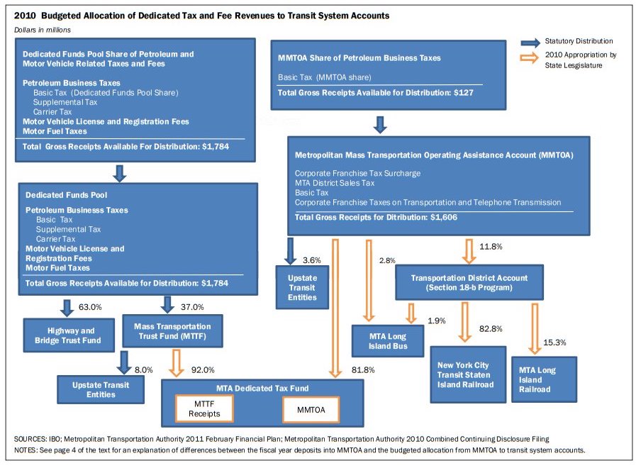 The proposal to reallocate gas taxes and weight them towards mass transit is a relatively simple one, in the sense that the taxes involved are already set and are collected by the state, and then allocated as 63 percent to the highway and bridge trust fund and 37 percent to a transit trust fund. The transit funds are then further filtered down between the MTA’s operating budget and money given to various upstate New York transit agencies. Here’s a flowchart, it’s all laid out in the boxes on the left side of the chart.