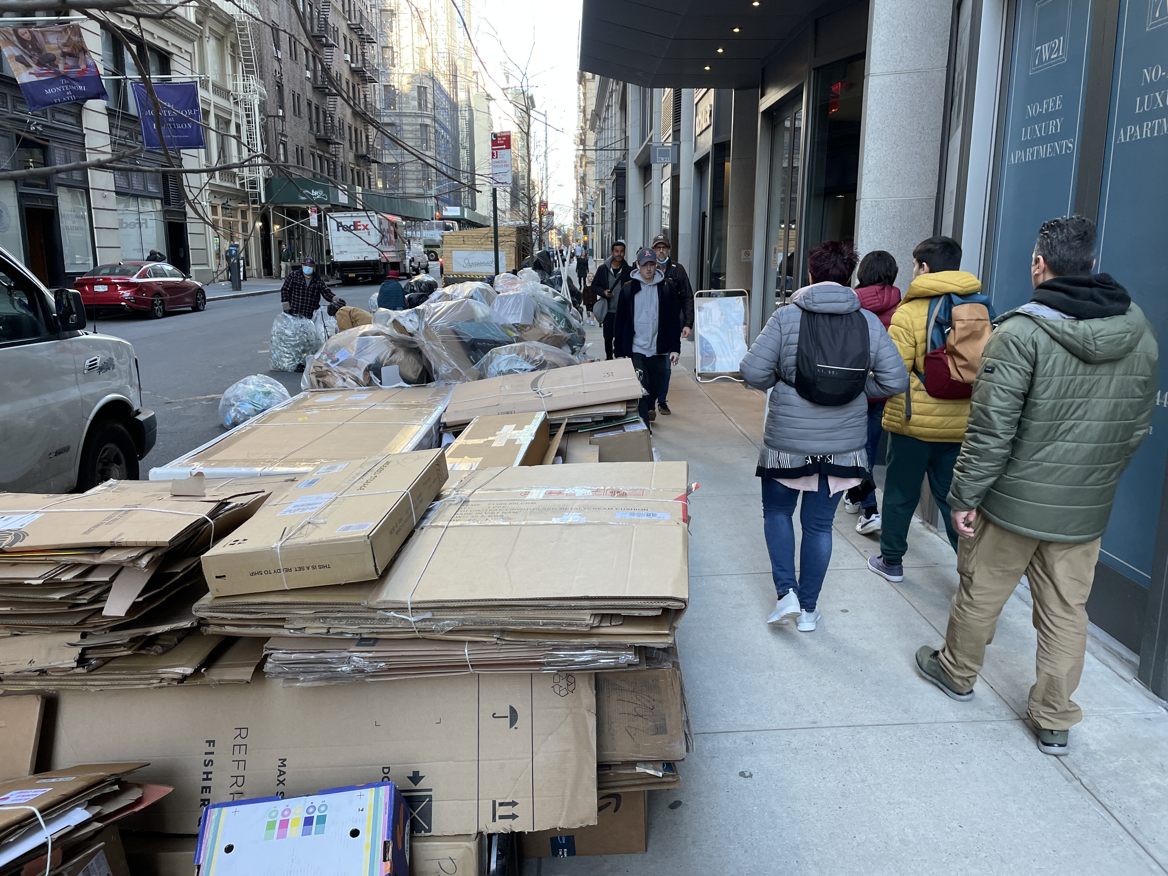 A rule proposed in 2020 that would require residential buildings with more than 300 units to store garbage off the street until collection day was never adopted; instead, DSNY requires buildings with 150 units or more to submit a waste management plan — which doesn’t require much except that the building remains “in accordance with all rules and regulations and may not impede the flow of pedestrian traffic or otherwise constitute a sidewalk obstruction, including maintaining, where practicable, eight feet of clear pedestrian space.”