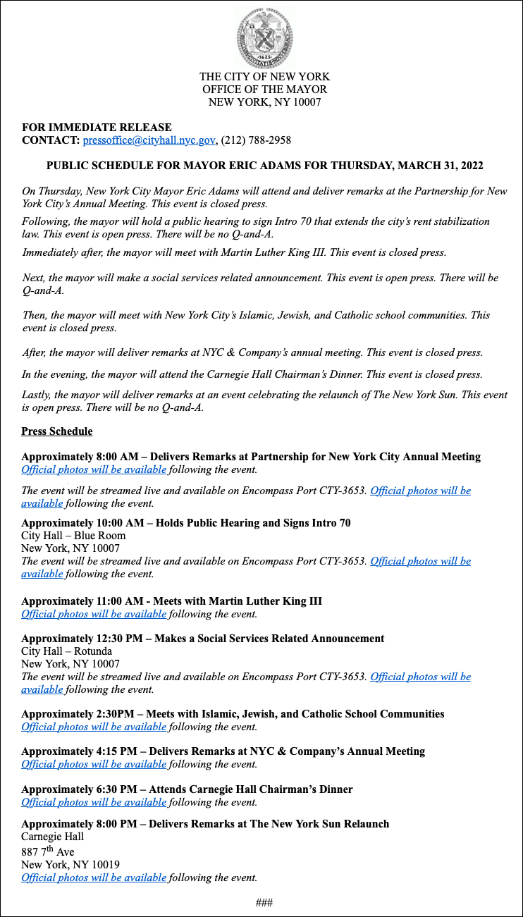 Mayor Adams told a stunned city press corps this morning that he intends to “have a quiet evening at home” tonight on the first of April, the first time since taking office that the mayor has not attended at least three events or two events and one all-night rager.