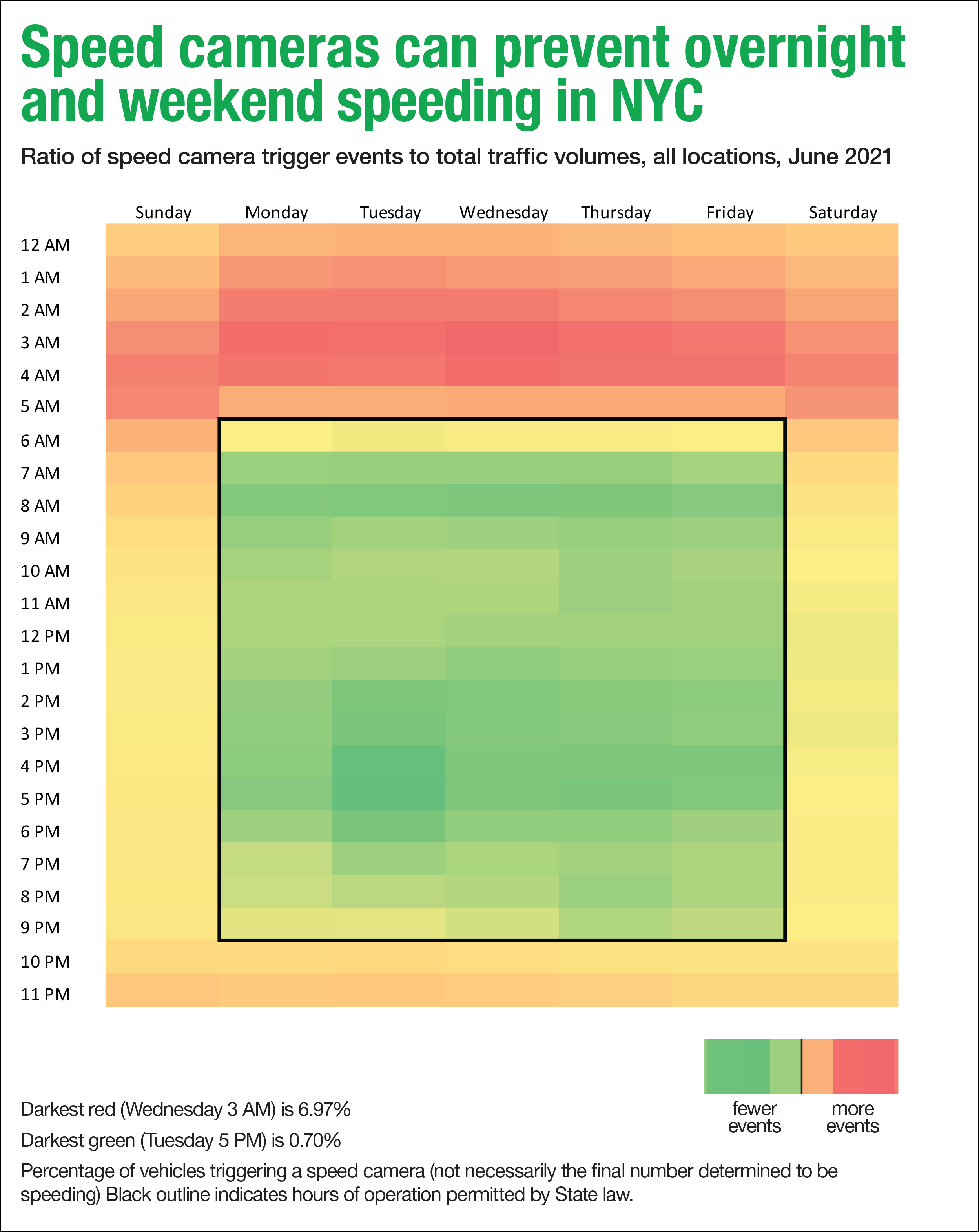 The Transportation Alternatives’ report, “Speeding Doesn’t Sleep: Albany’s Deadly Practice of Restricting the Operating Hours of New York City’s Speed Safety Cameras,” is the latest compendium of long-known facts that bolsters advocates’ demands for full, 24-7 speed camera operation in myriad ways. The facts include: