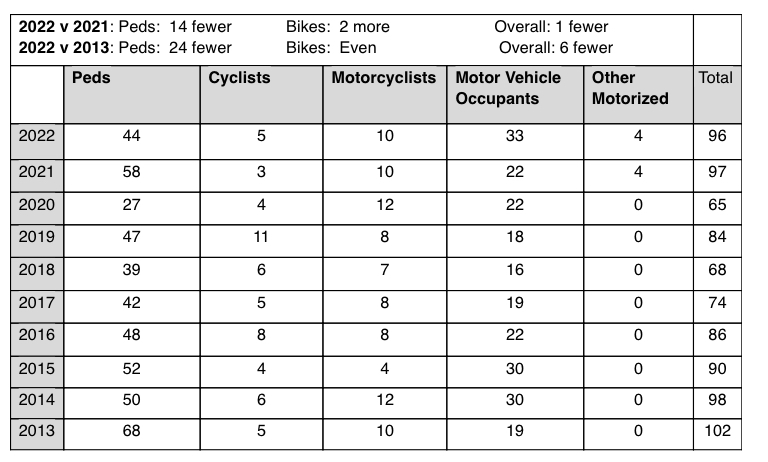 Like 2021, this year has been horrifyingly bloody on the streets of New York, with close to 100 people dying in crashes through June 2, according to the year-to-date chart provided by the Department of Transportation: