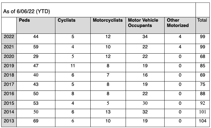 Death continues to stalk New York City streets, according to the year-to-date fatality chart created by the Department of Transportation: