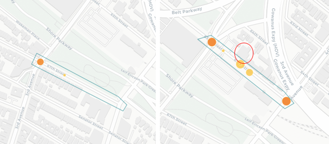 This is a map of crashes since 2018 on two Bay Ridge blocks — one with a police stationhouse (right), one without. The location of the 68th Precinct house is circled. Graphic: Crashmapper