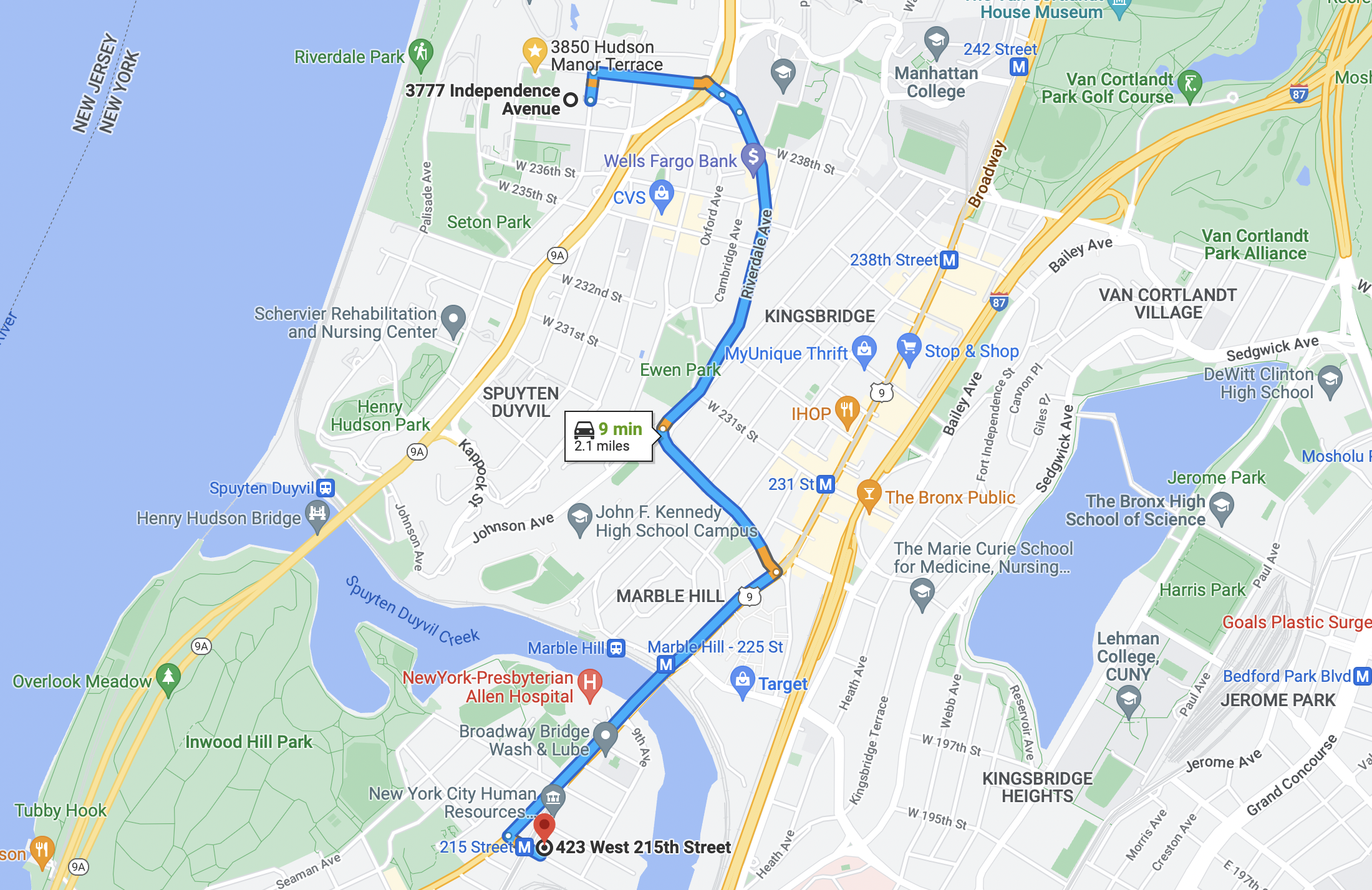 Route from the nearest garbage truck depot to the corner with the carcass. Map: Google