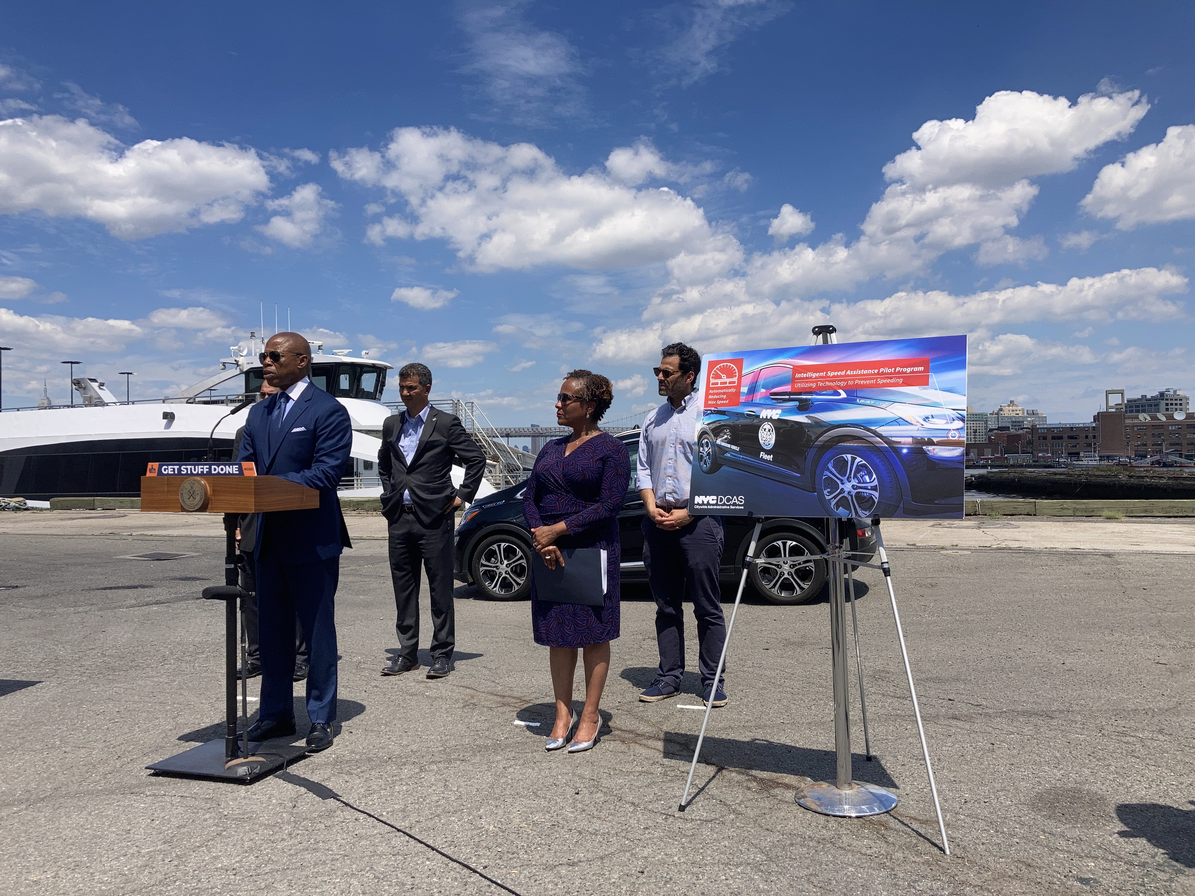 Mayor Adams announcing new technology to prevent speedsters in city vehicles. Photo: Julianne Cuba