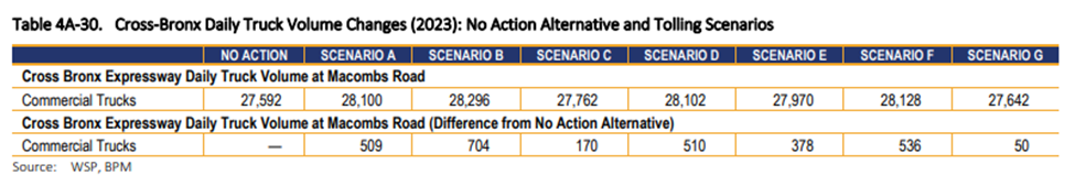 The numbers that the MTA presents are clear. In all scenarios except for “G,” under which car and truck tolls in the central business district would be identical, the Cross-Bronx Expressway would shoulder between 170 and 704 more trucks each day. These additional trucks represent an increase ranging from 0.6 percent to nearly 2.5 percent.