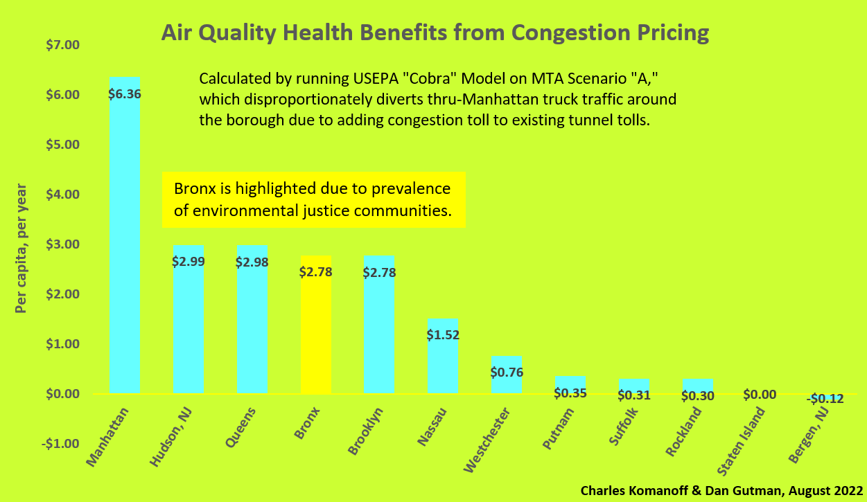Manhattan air quality improves the most, not surprisingly, because that borough is projected to experience the biggest drop in vehicular traffic once cars and trucks are charged a fee to drive into Manhattan south of 60th Street. Under the toll scenario that the MTA scrutinized for emissions in its environmental assessment of congestion pricing, Hudson County (N.J.), Queens, The Bronx and Brooklyn also benefit considerably, with air-quality health benefits nearly half as large as Manhattan’s, on a per-capita basis.