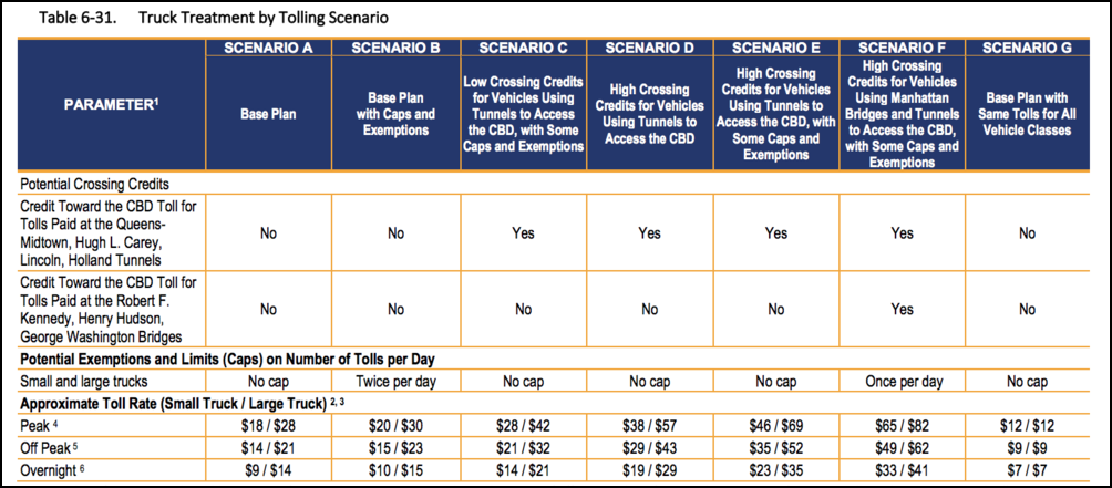 Under Schwartz’s thinking, truck tolls shouldn’t be more than 2.2 times higher than whatever the toll is for private cars, which under the various congestion pricing scenarios range from $9 to $23 for peak-hour tolls.
