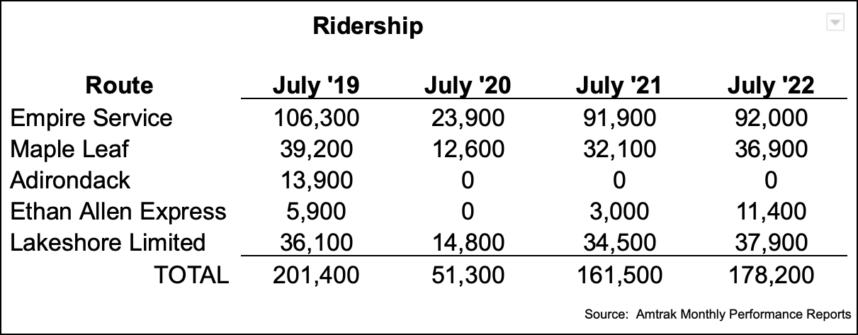 It’s still not enough: Riders want to take the trains, and too many of the trains are jammed full! Even missing several daily trains, Amtrak ridership in New York state has climbed back from the bleak numbers of the first half of 2020. In fact, in July 2022 ridership was only 23,200 riders below the pre-pandemic July 2019 numbers — and the lack of trains has seriously inconvenienced passengers.